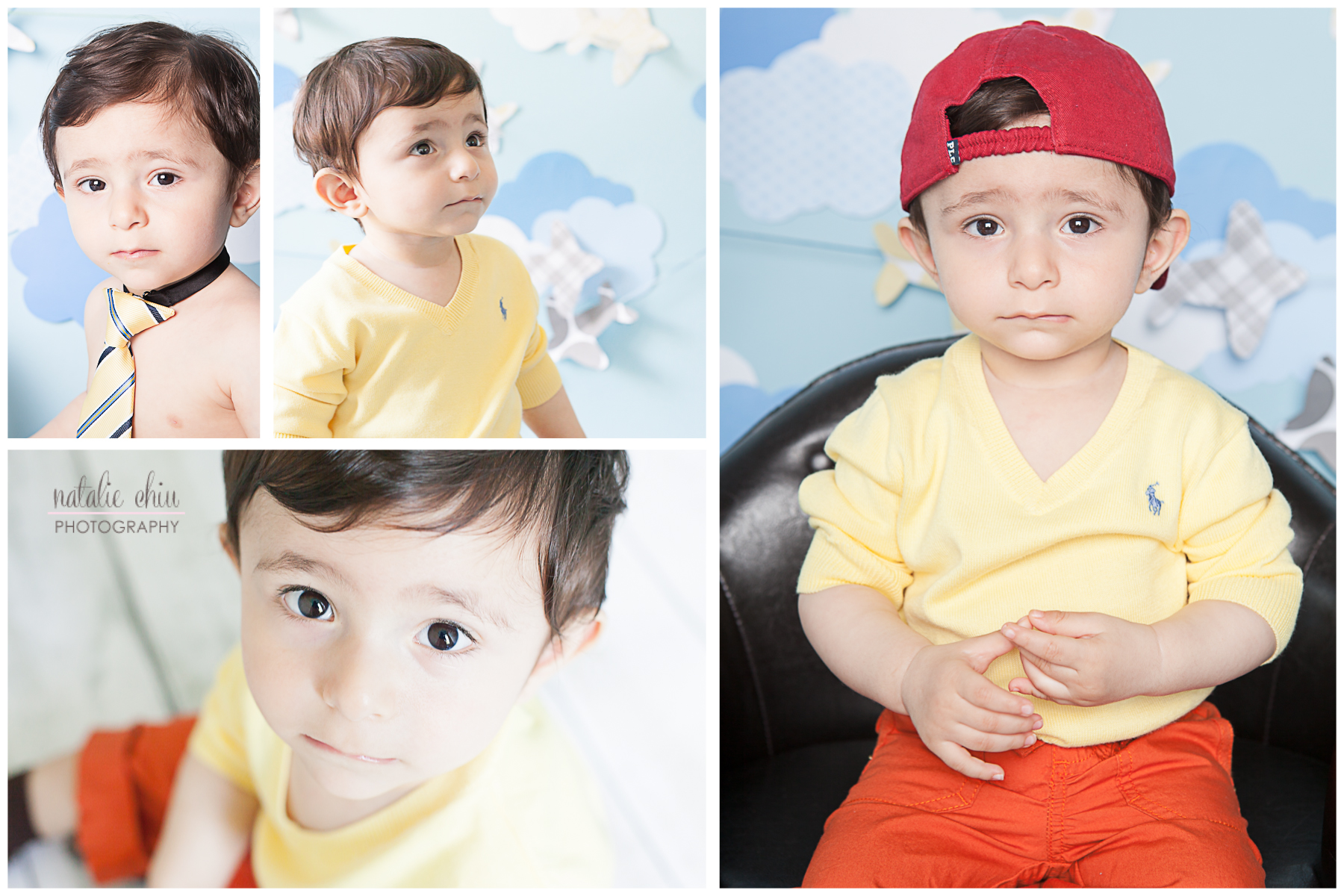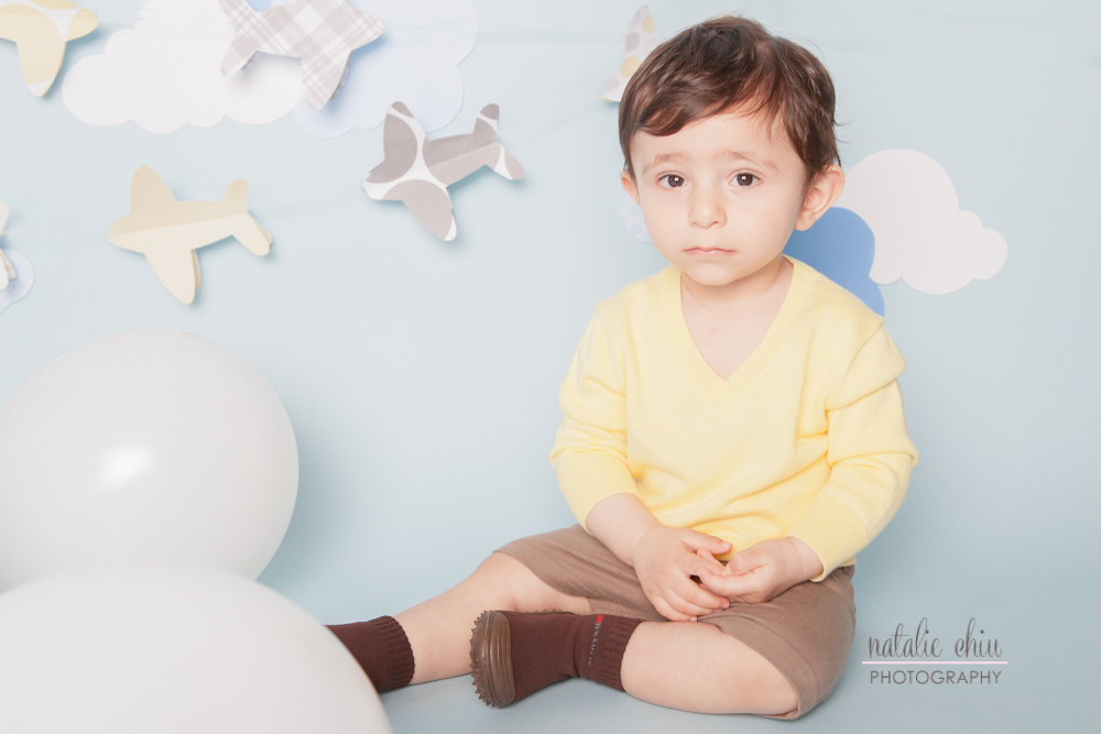 This little guy just turned one year old and had an high-flying birthday photo shoot! I was really looking forward to him getting all messy with the typical cake that goes along with these sessions, but he was not a fan of cakes. His mom put an excellent effort trying to warm him up to the cakes at home, but she had little success so we scrapped that idea and just did a cake-less shoot! Luckily for me he didn't really cry but he was uber serious! He did crack a few smiles here and there though He had the cutest expressions on his face.